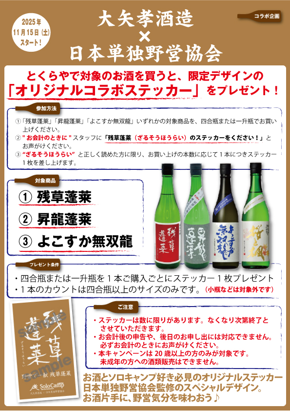 大矢孝酒造 × 日本単独野営協会 のスペシャルコラボが実現!